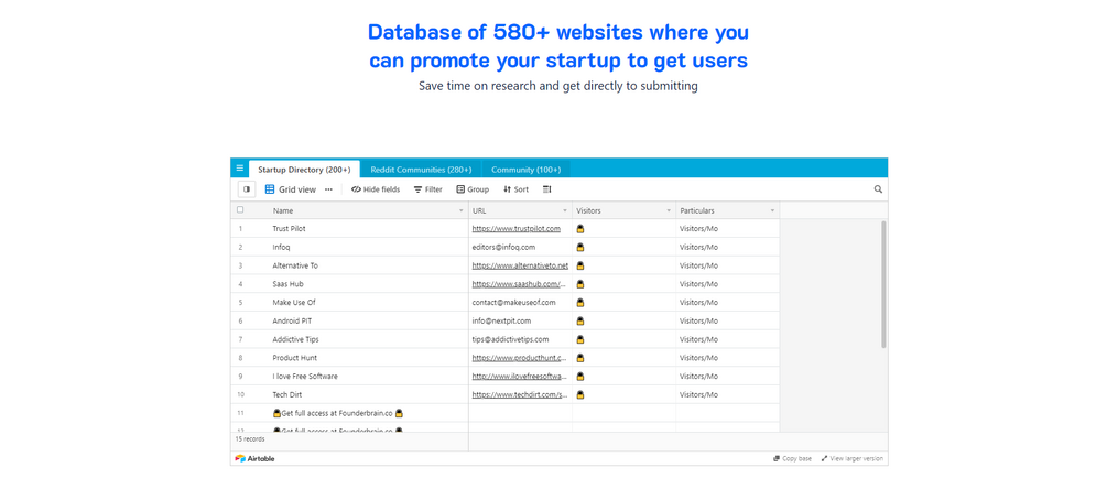 Simply find the appropriate websites for your startup in our database. Use it whenever you need it.
